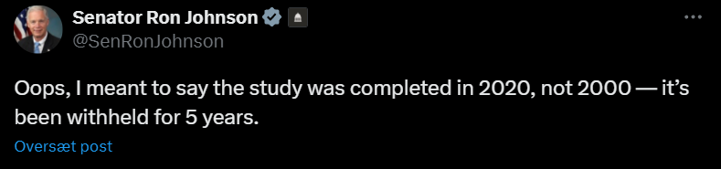 Rettelse: @SenRonJohnson retter nu sin udtalelse og siger studiet er fra 2020 og ikke år 2000. Så det har været skjult i 5 år og ikke 25 år!